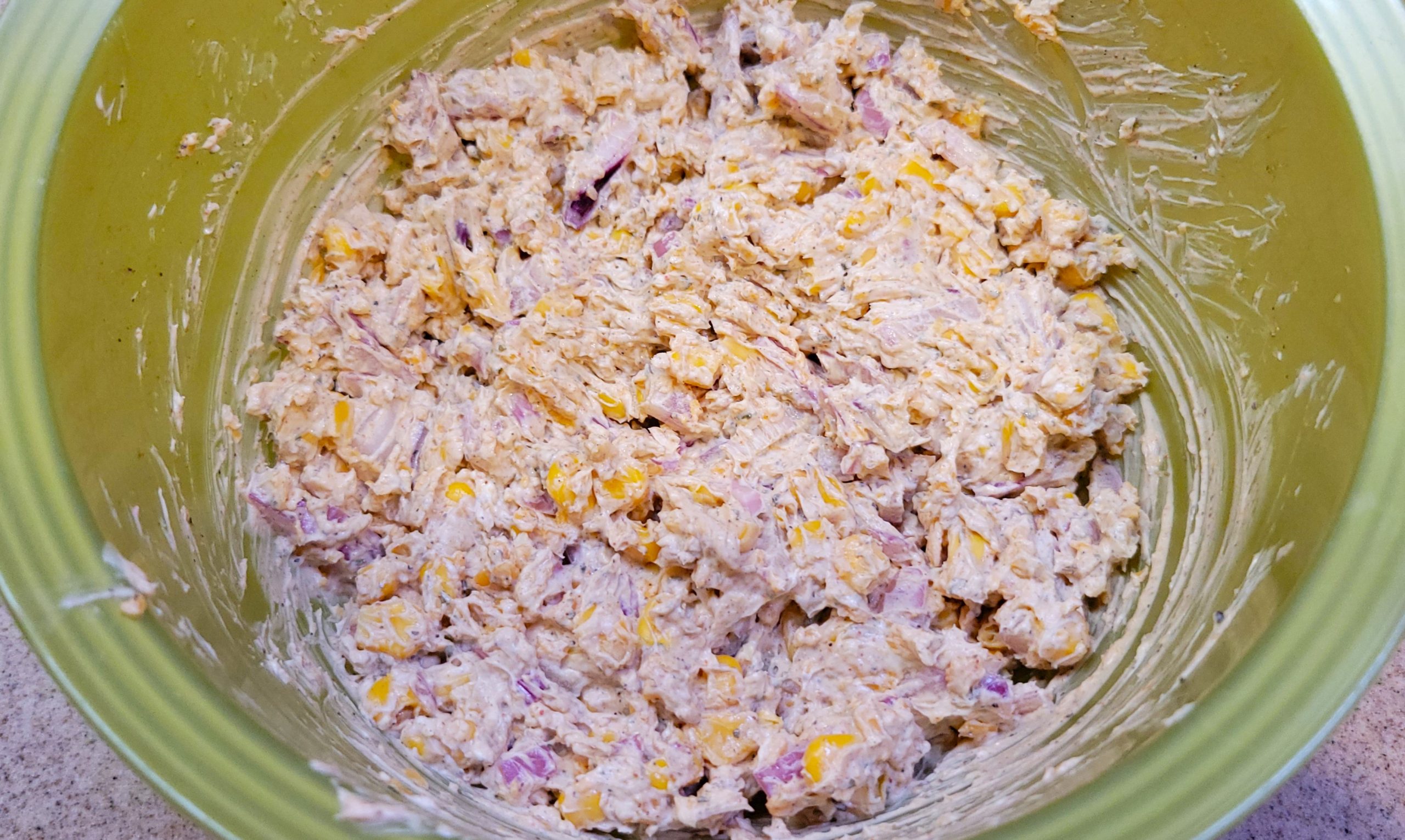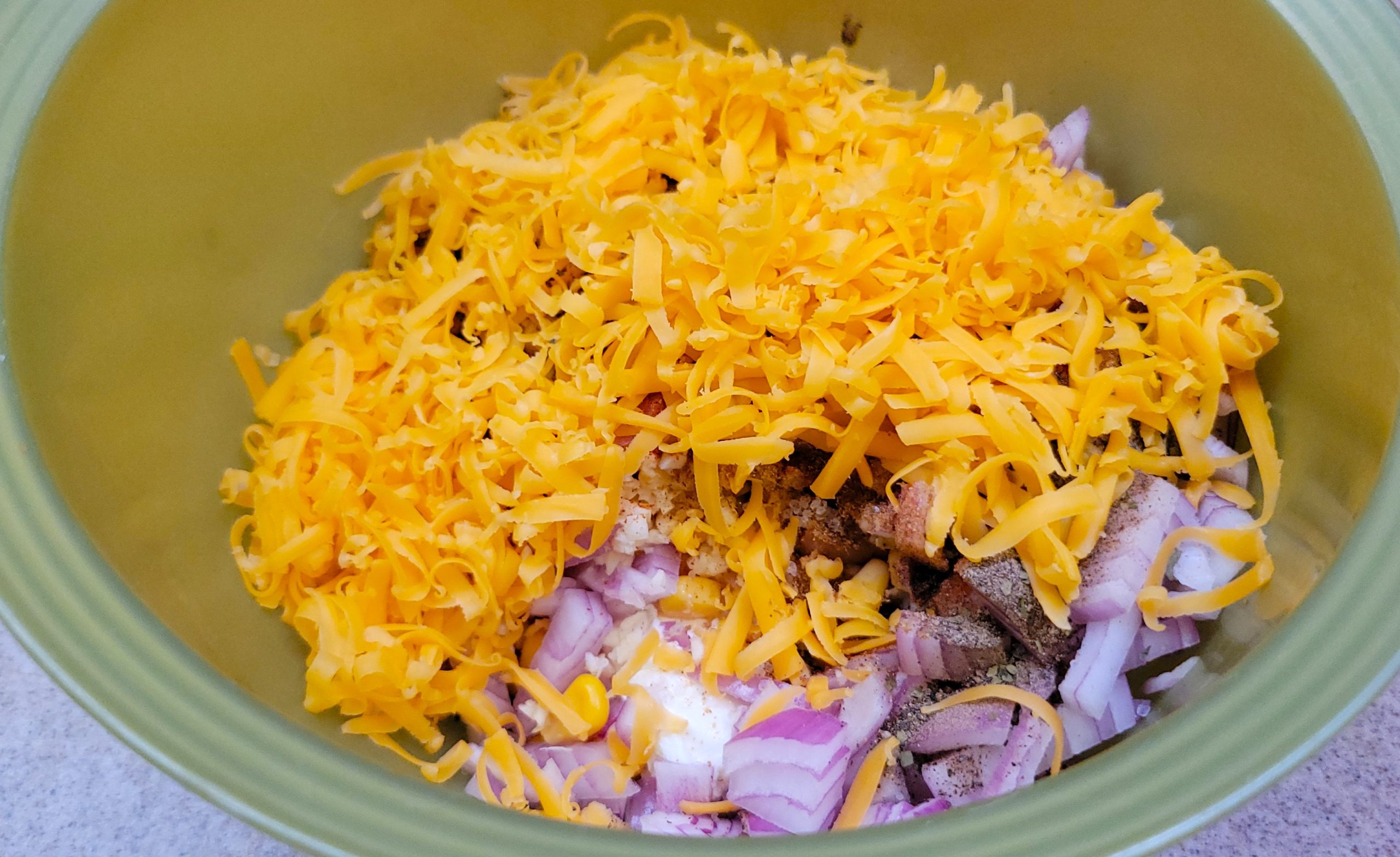 1. First, you will need a Bowl for Mixing. Next, Add Package of Cream Cheese, Shredded Cheddar Cheese, Minced Garlic, Diced Red Onion, Can of Whole Kernel Corn, Ground Cumin, Chili Powder, Dried or Fresh Cilantro, Ground Black Pepper and Salt to the Bowl.